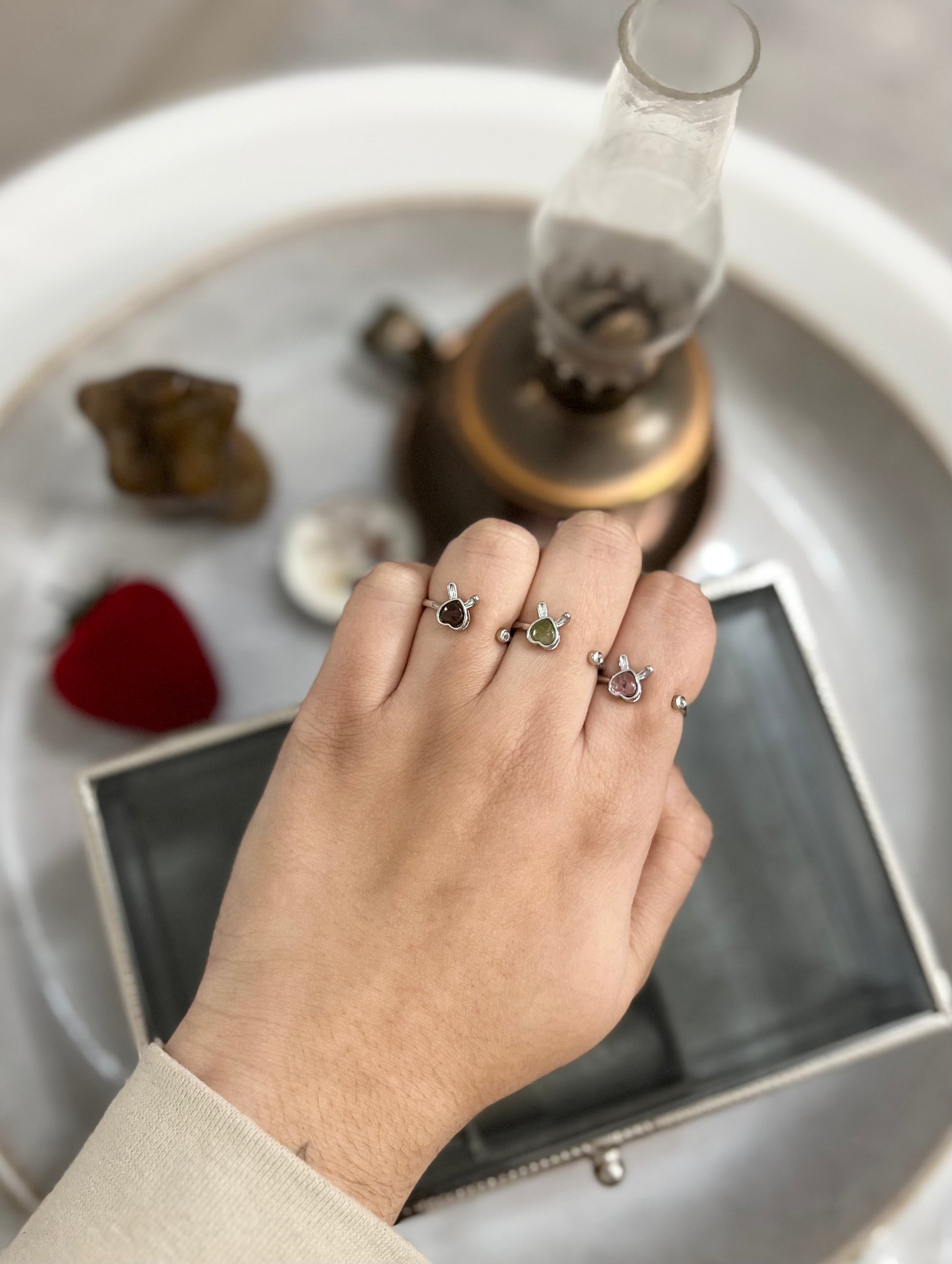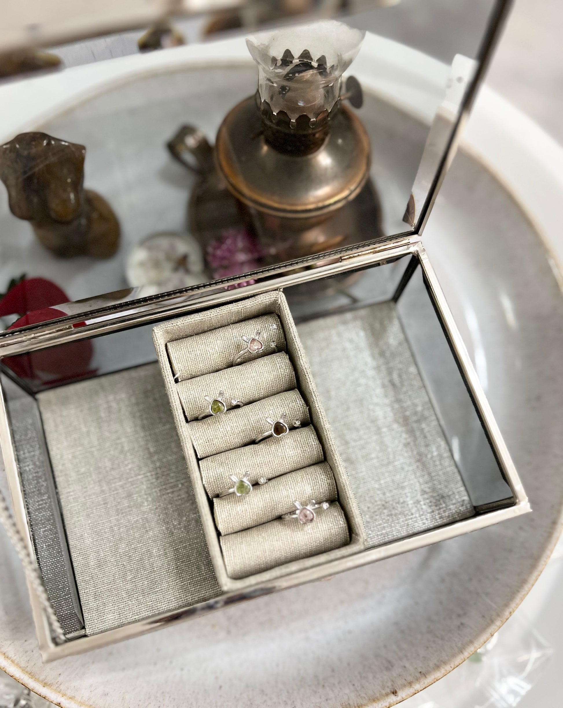 This ring is adjustable and is silver plated with a gorgeous piece of crystal stone in the centre. A ring will be picked intuitively for you out of the ones you see in these pics.