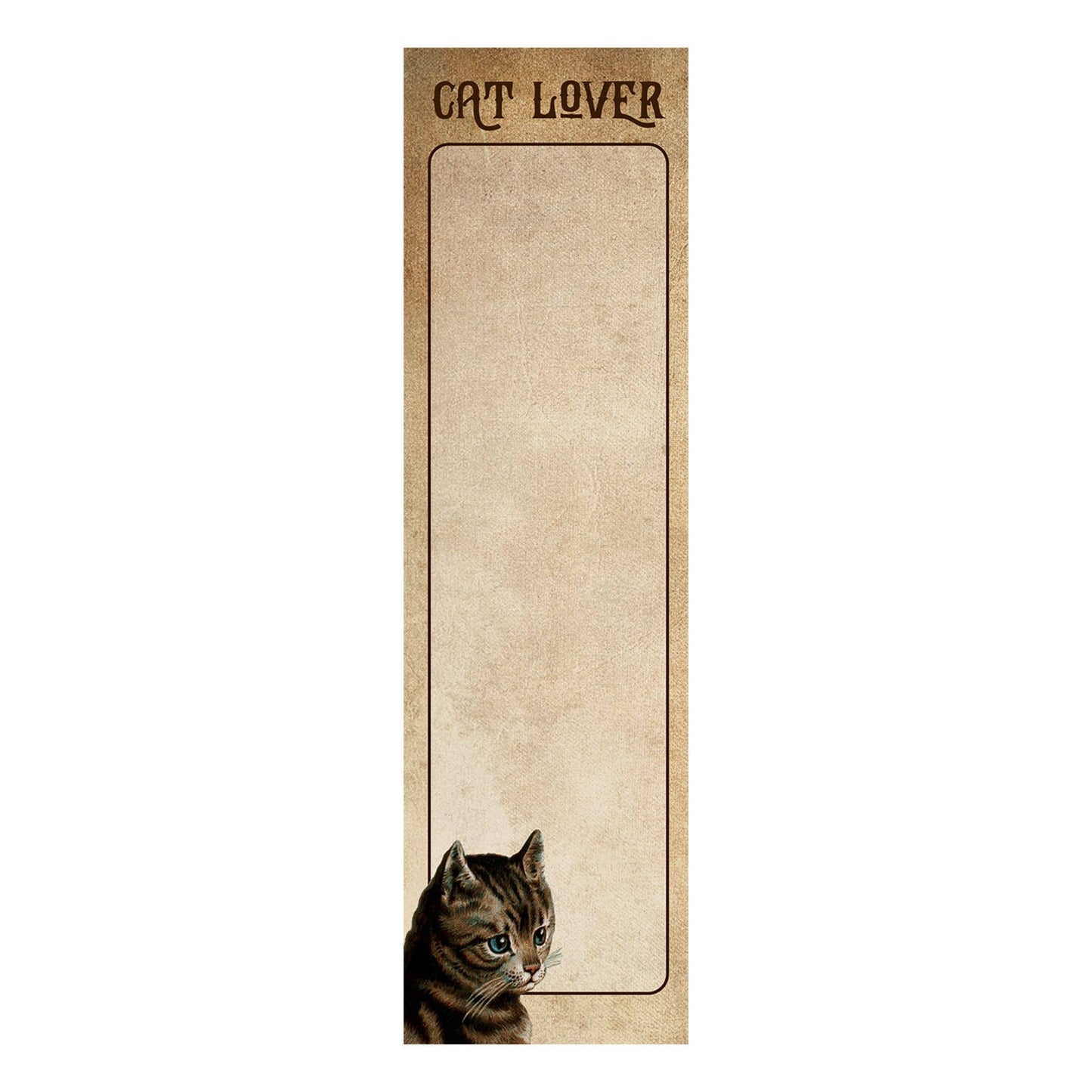 The Cat Lover Notepad depicts a brown kitten with black stripes, and the phrase "Cat Lover." It's a great way to keep track of lists, notes, and messages, and has a magnet on the back for easy hanging. The notepad has 50 sheets and measures 9-1/2" high by 2-3/4" wide.