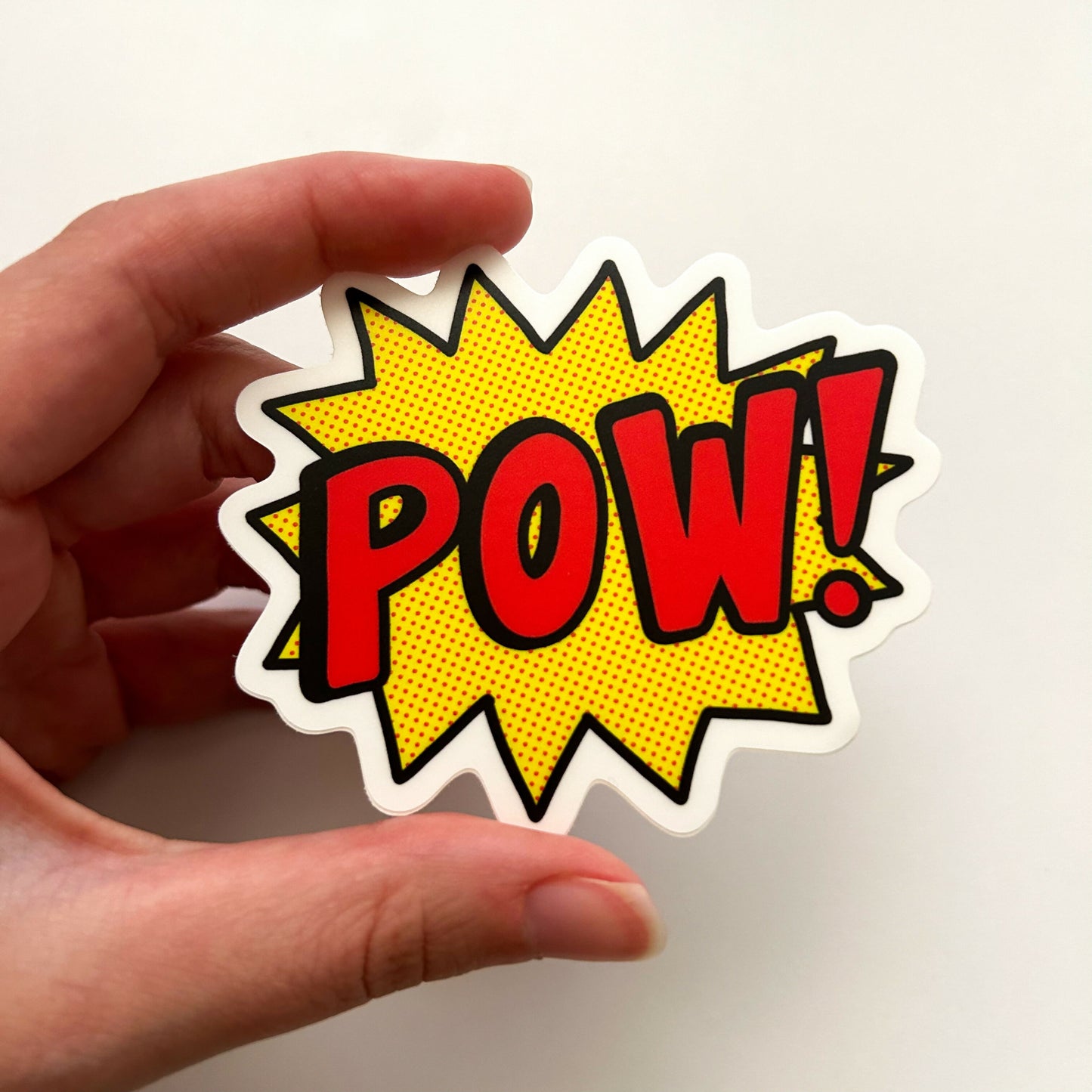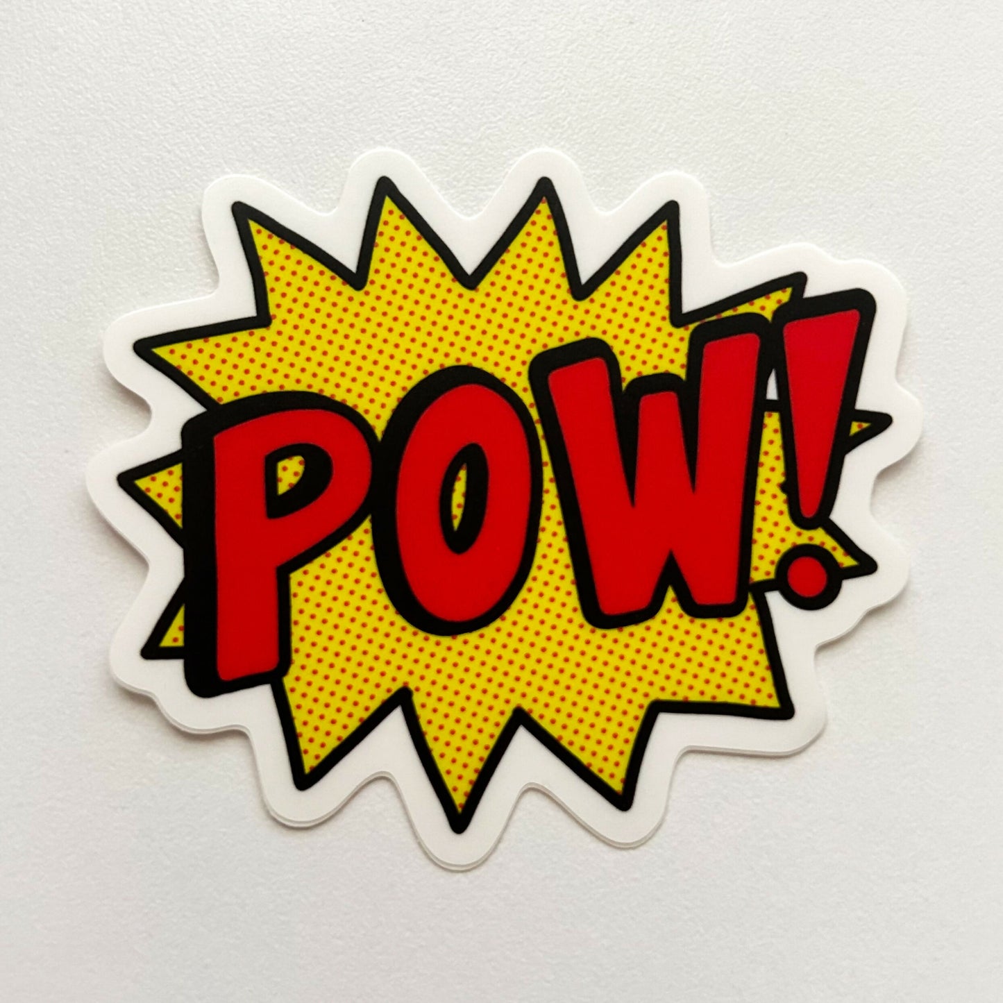 This sticker featuring the text "POW!" is made from durable vinyl. Use this sticker on laptops, notebooks, and more. The size is approximately 3" on the longest side.