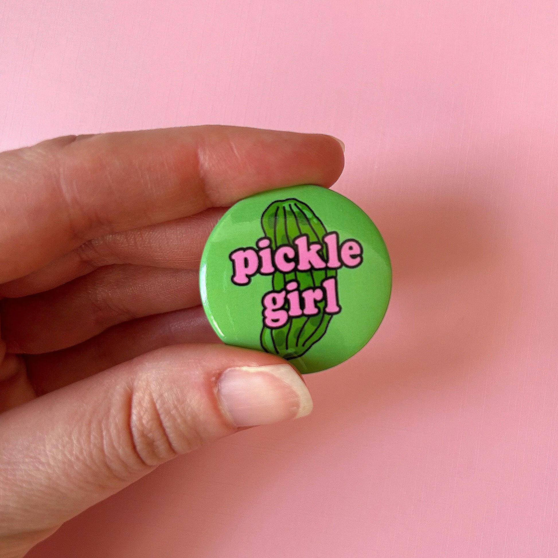 This cute button pin features the text "pickle girl" with an illustration of a pickle.