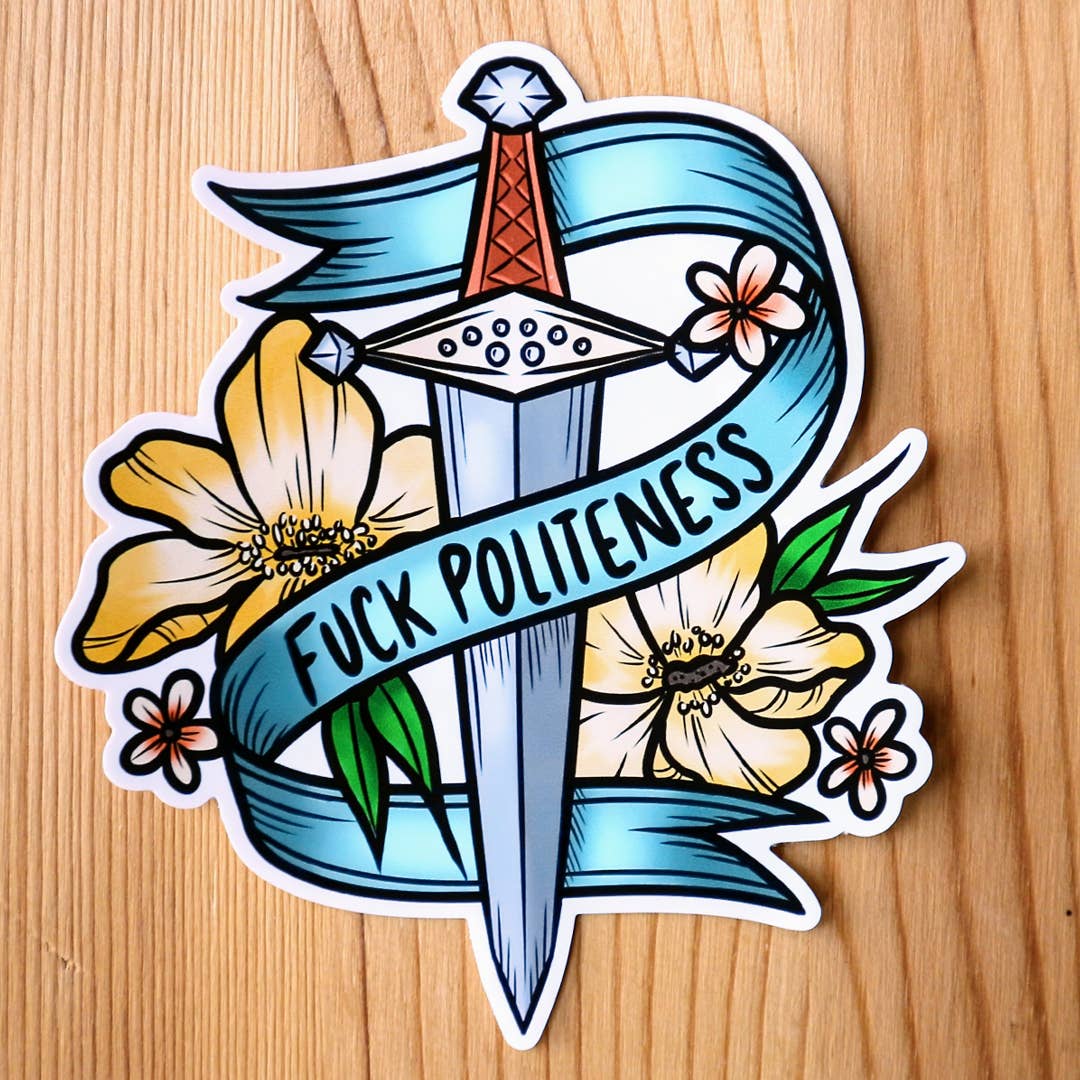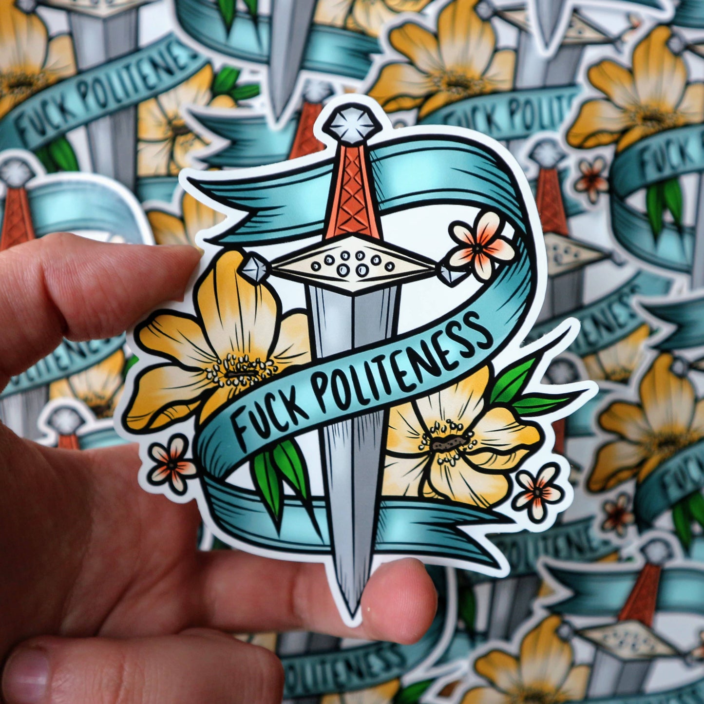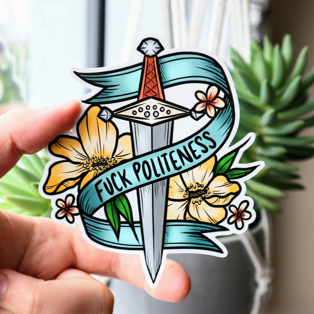 So anyways, in case you needed to hear this today, fuck politeness! Take care of yourself first, always! 3.5"x4" die-cut vinyl water-resistant sticker, designed by an independent artist in Ottawa, Canada (that's me!) and printed by a fellow small business in Montreal. Beautiful and glossy, these stickers are water-proof and won't peel or flake whether they're on your water bottle, your laptop or your car bumper.