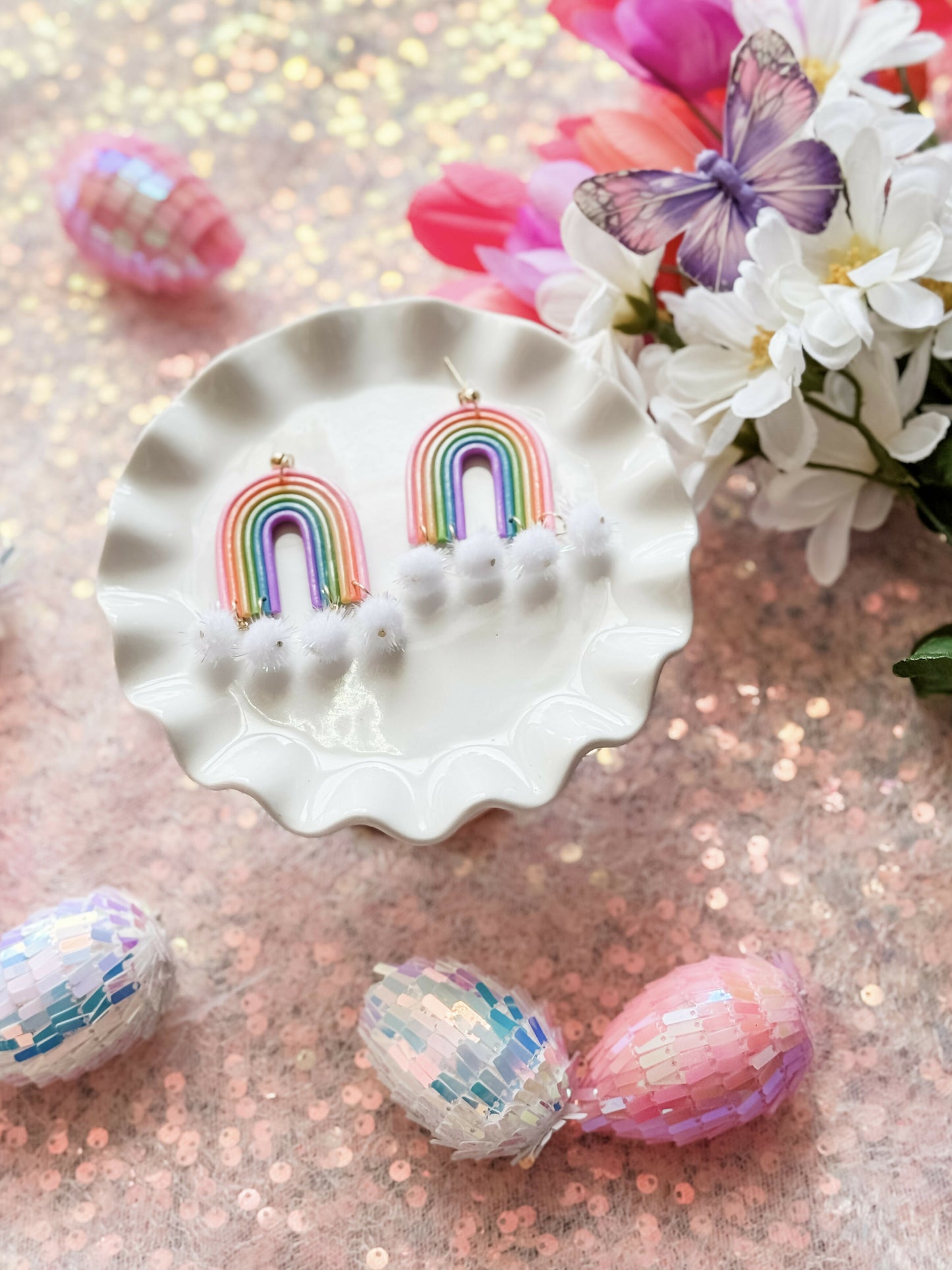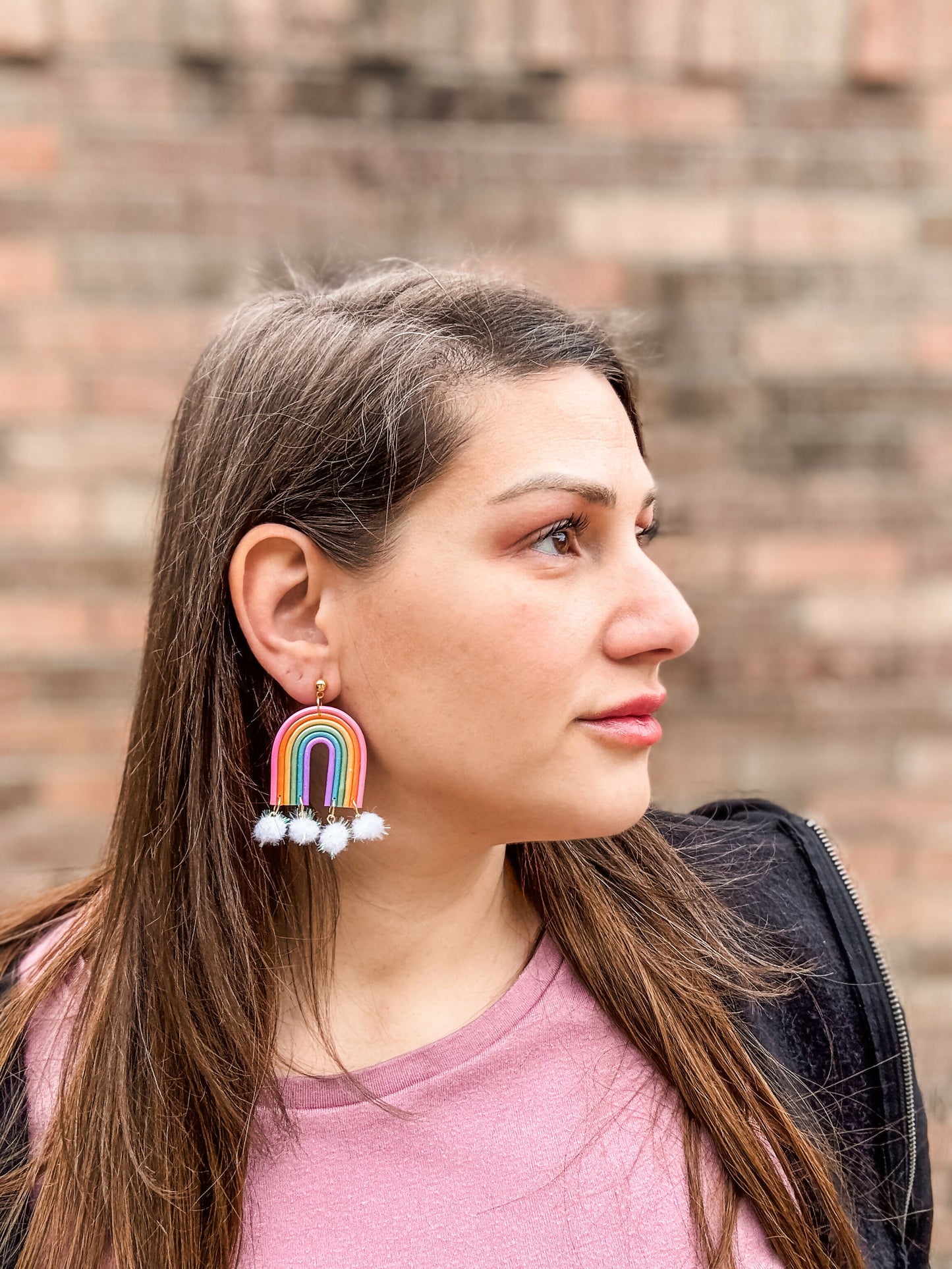 Add a splash of sunshine to your jewelry collection with our vibrant Rainbow Earrings! Handcrafted from colorful polymer clay, these boho dangle delights are the ultimate statement accessories that will brighten even the gloomiest of days. Perfect for those who like to strut their stuff with a little pizzazz, these earrings promise to turn heads and spark joy with every swing and sway. Who needs a pot of gold when you can wear your very own rainbow?