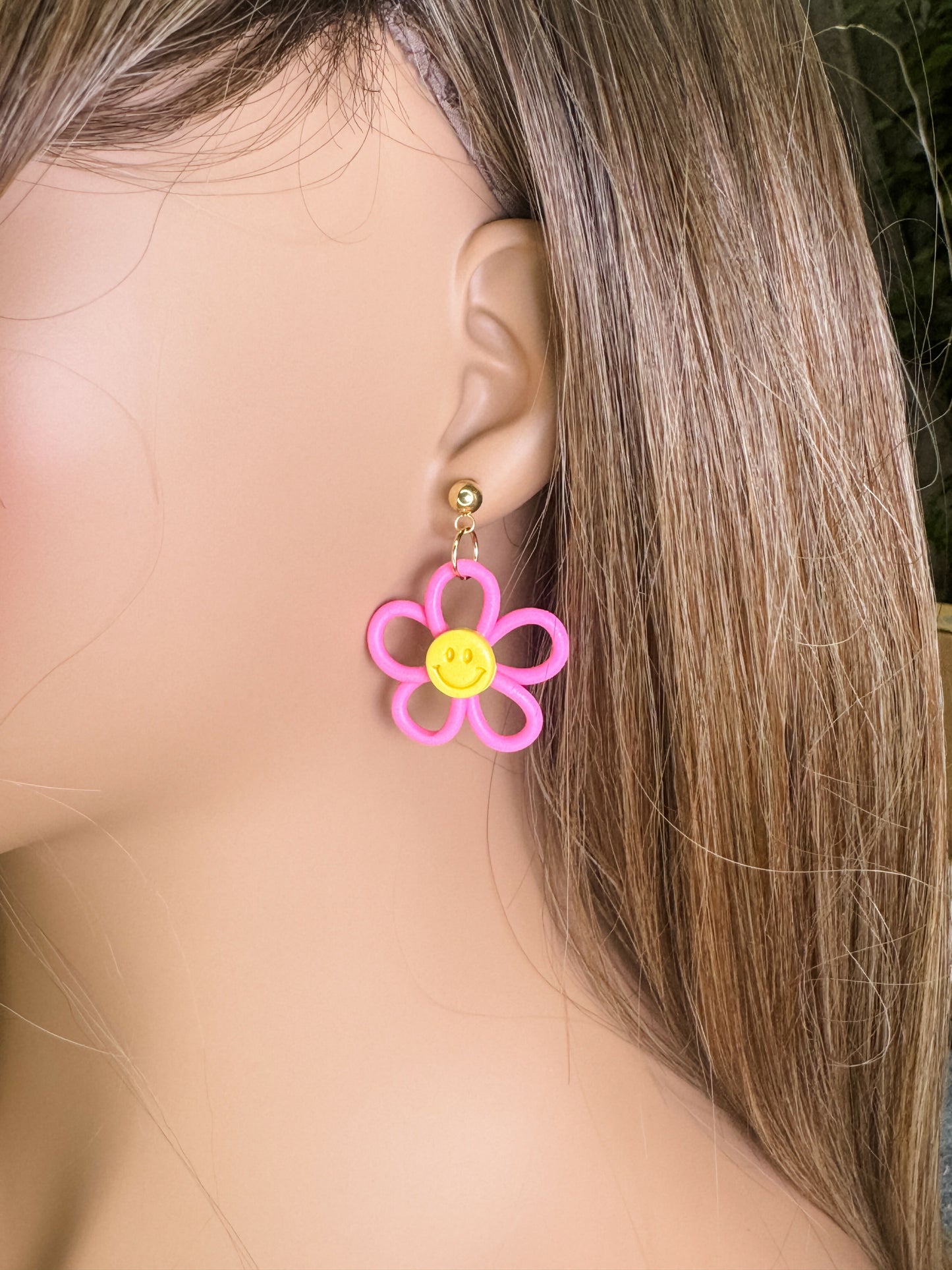 Turn up the happy vibes with these Retro Smiley Face Flower Earrings! Featuring a bold hollow petal design in bright pink with a cheerful yellow center, these earrings bring sunshine and sass to any outfit. Handmade from lightweight polymer clay, they’re perfect for fans of Y2K fashion, kawaii aesthetics, and playful accessories.