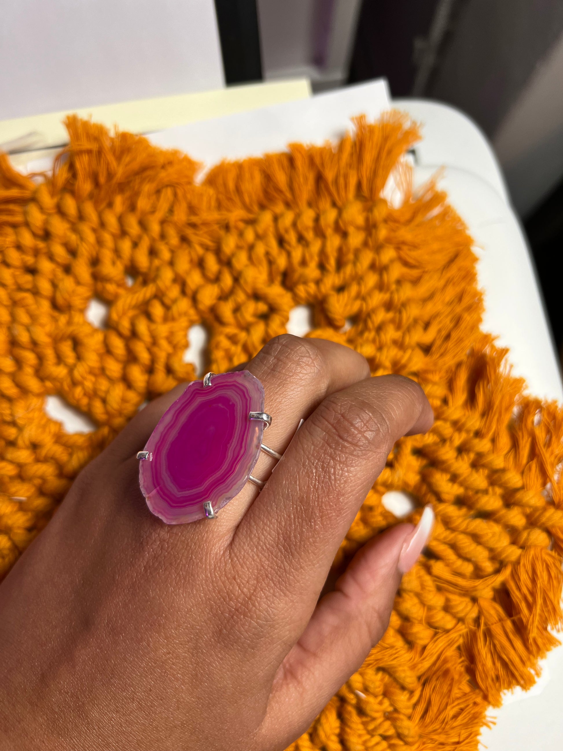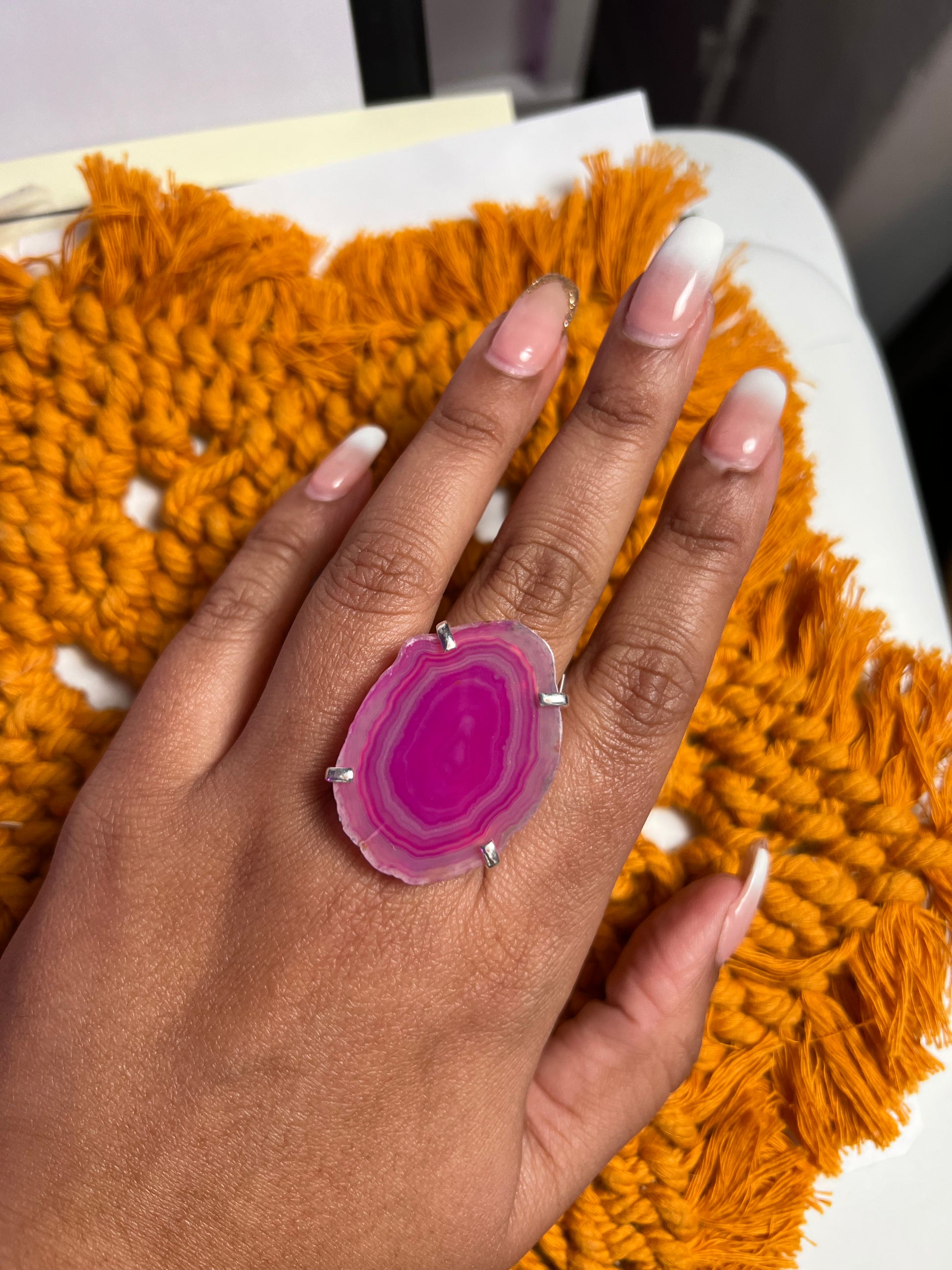 This ring is adjustable and truly a statement ring. It is silver plated with a gorgeous piece of pink agate stone in the centre. A ring will be picked intuitively for you out of the ones we have available, it could be any type of colour or banding, if you're interested in a specific type please email us first as there are no returns on crystals.