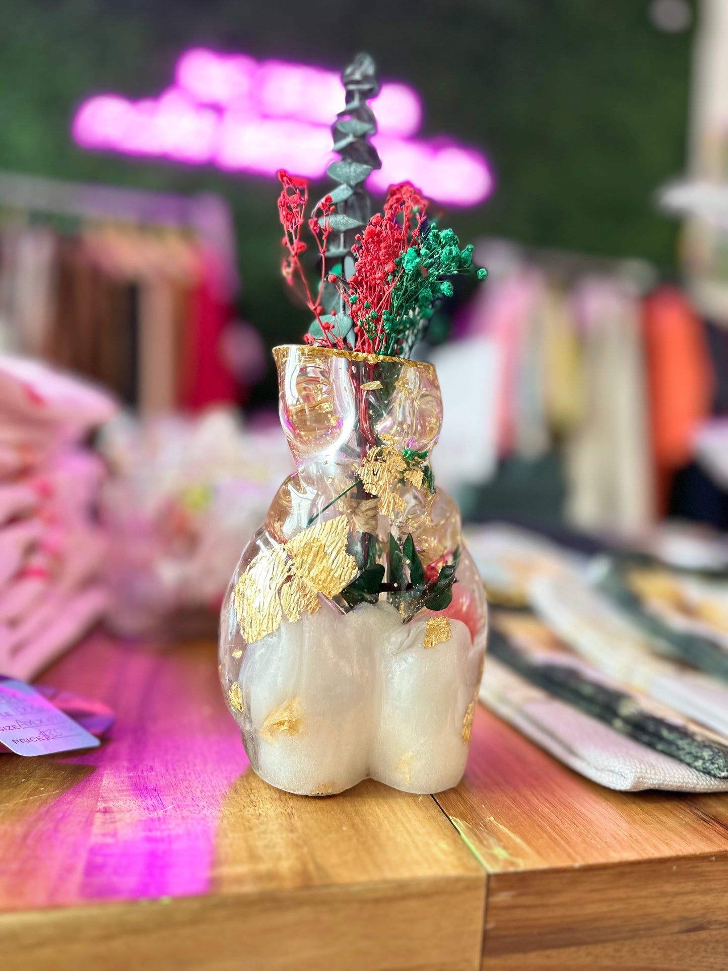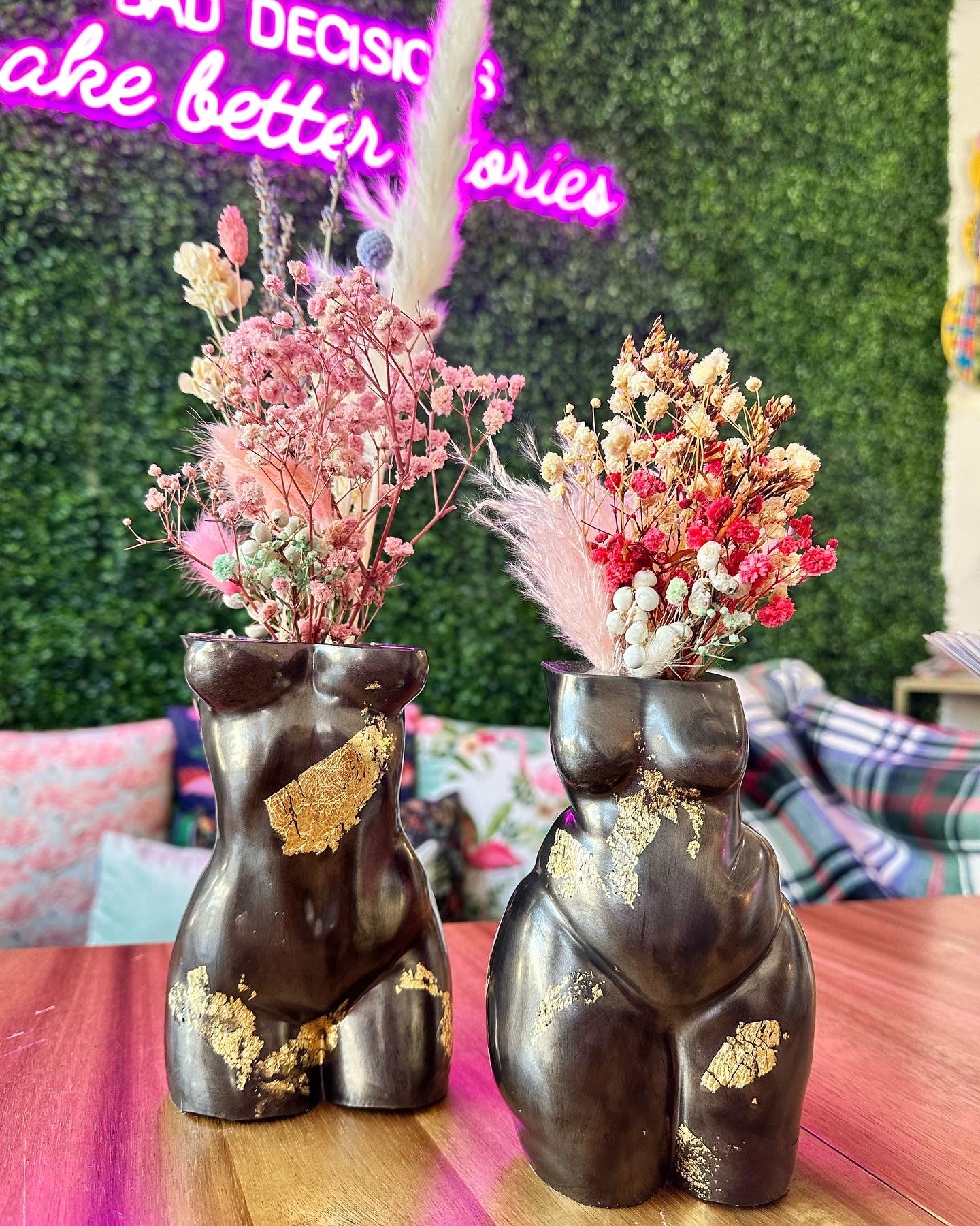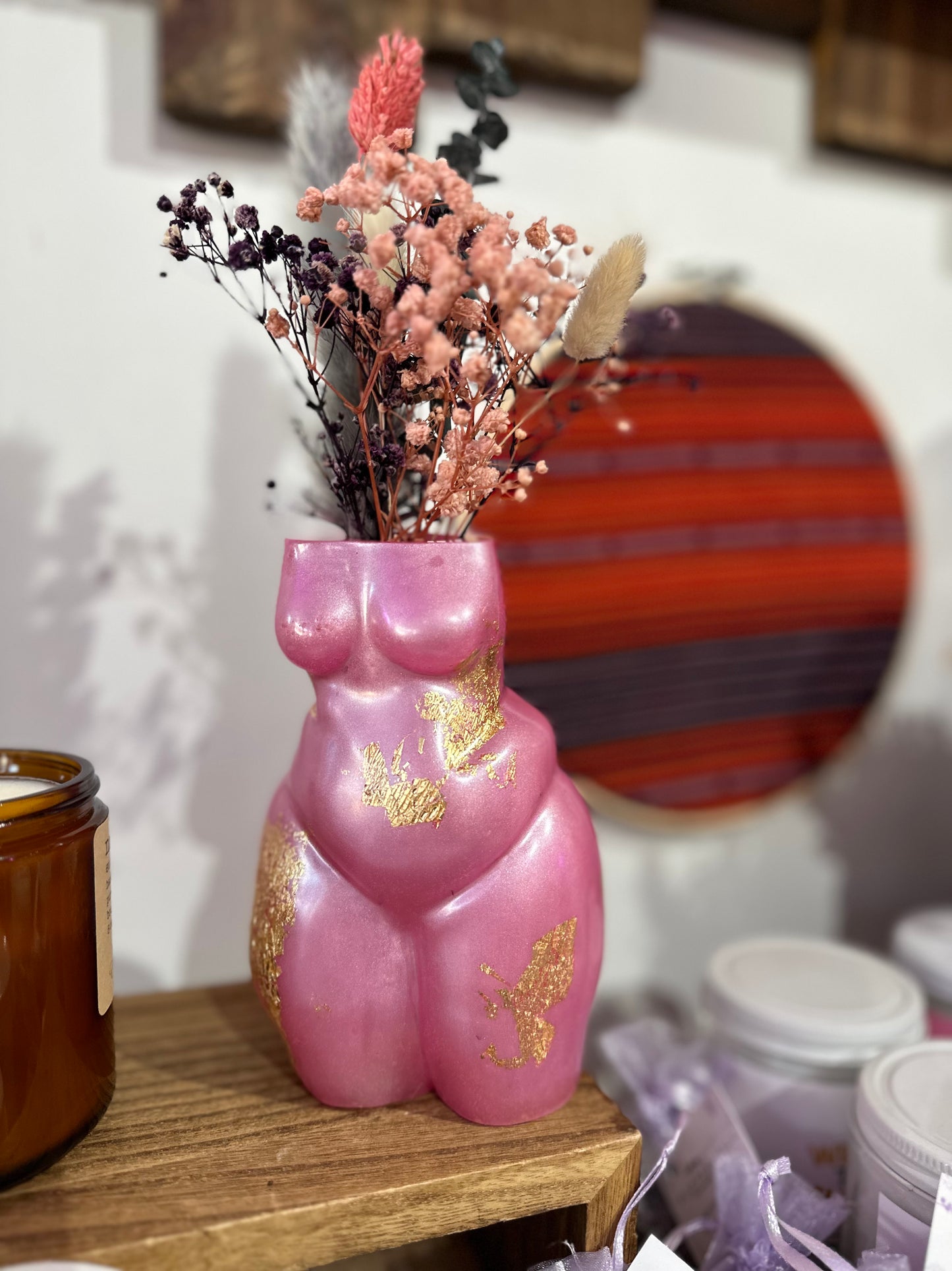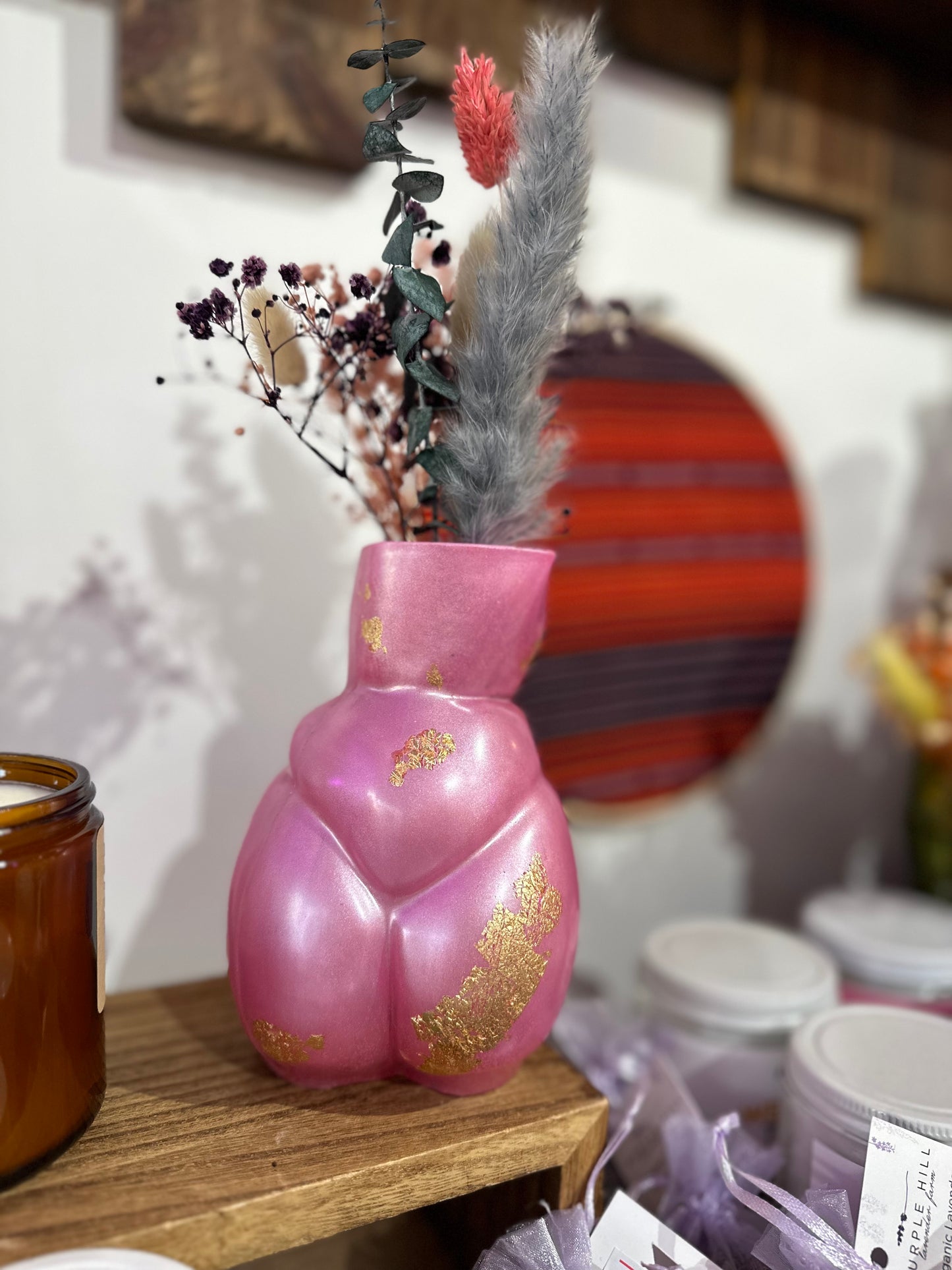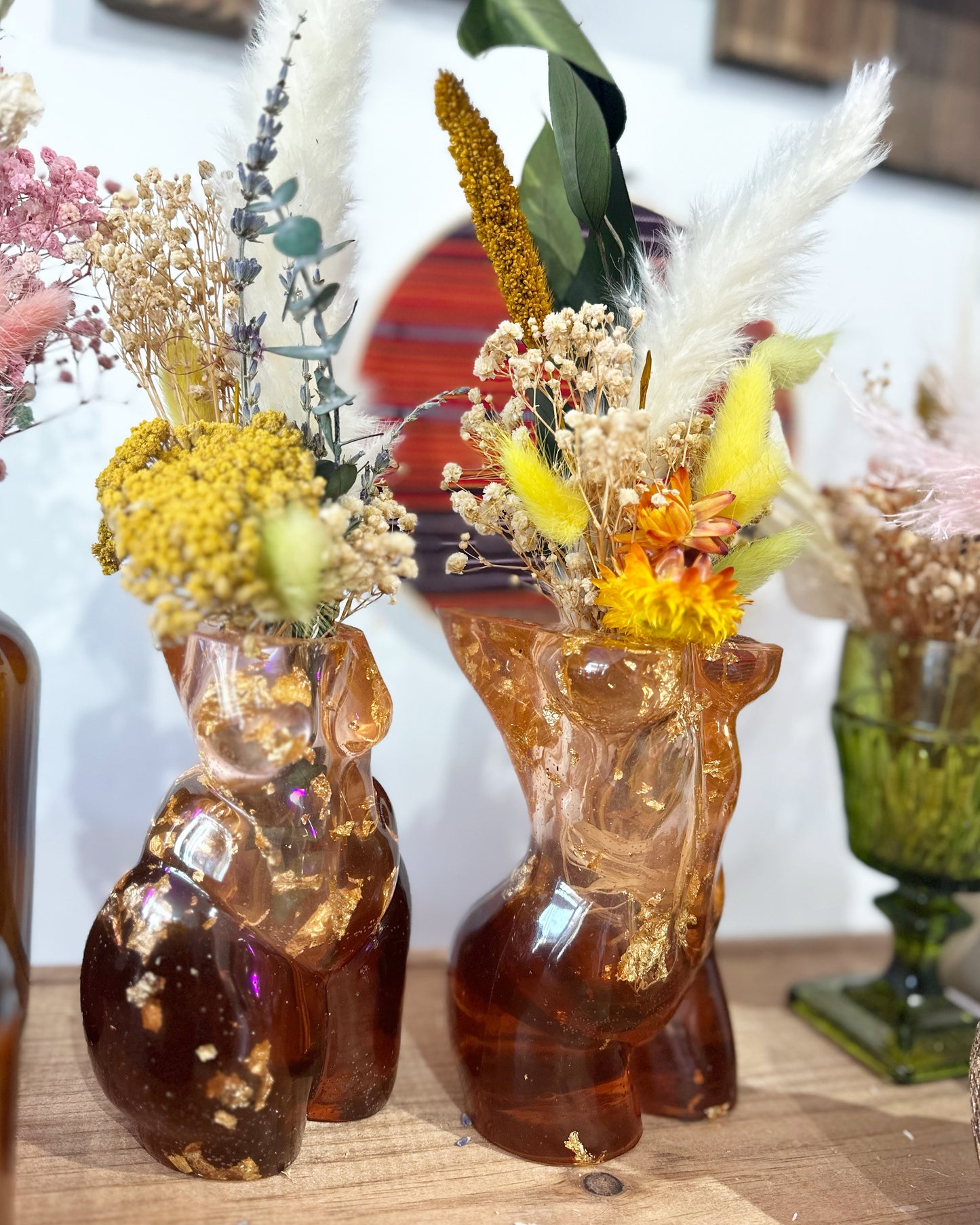 Draw attention to your room with these unique and empowering resin vases! Adorned with a dried flower arrangement and crafted with body-positive design elements, each one is made to order with 3-4 weeks of prep time. Add a little beauty, plus some attitude, to your decor. 💗