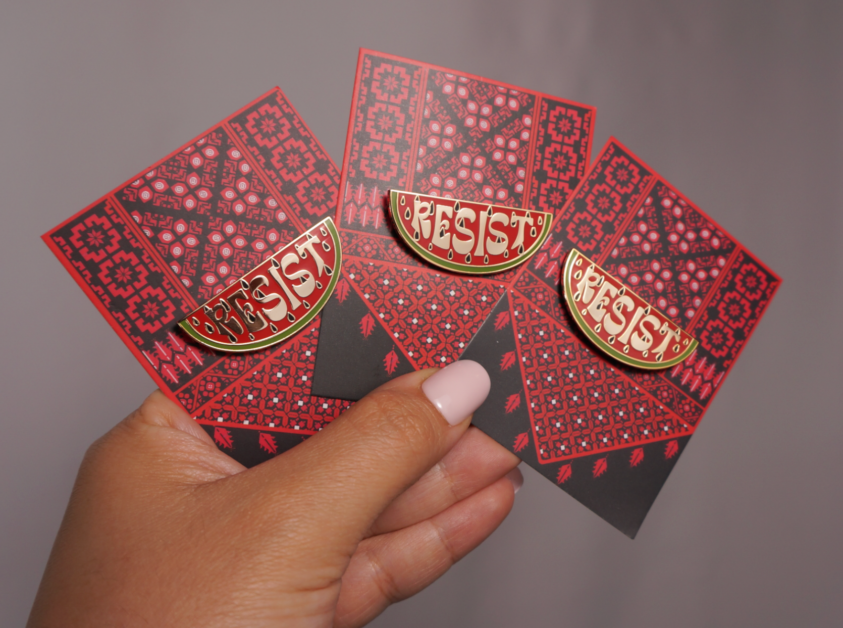 Presenting our vibrant Watermelon Resist Enamel Pin, a powerful symbol of solidarity for Palestine's resilience and resistance. This unique lapel pin, adorned with the word "Resist," serves as both a statement of support and a meaningful gift for those advocating for Palestine's freedom. -Pin is hard enamel with two metal butterfly clasps -Pin measures 1.5” in length