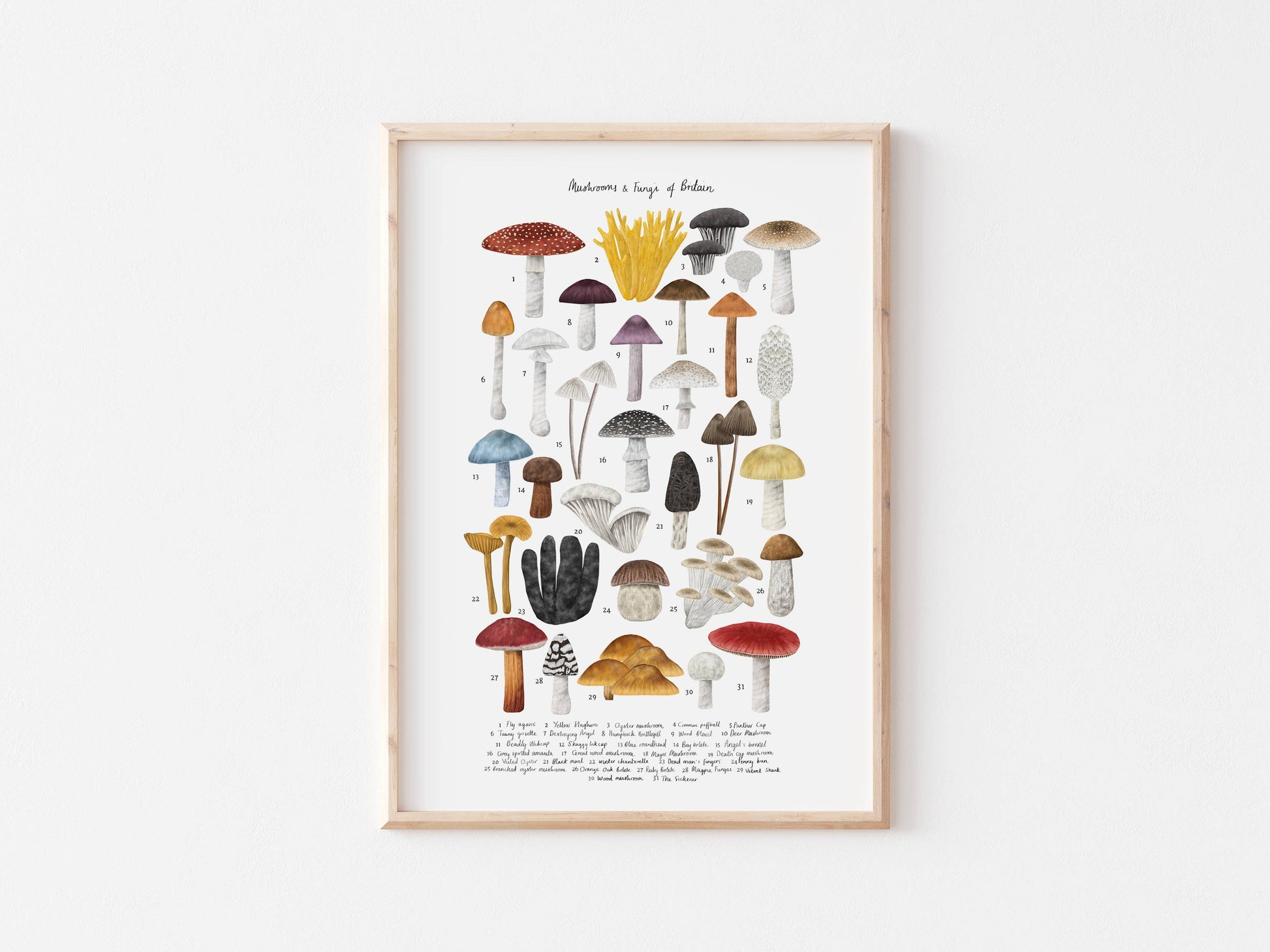 Illustration of Mushrooms & Fungi of Britain Available in a white or black background Printed onto matte archival paper. Signed in the bottom right corner, packaged in a biodegradable sleeve and has greyboard backing to keep the print as flat and as safe as possible. Frame not included.